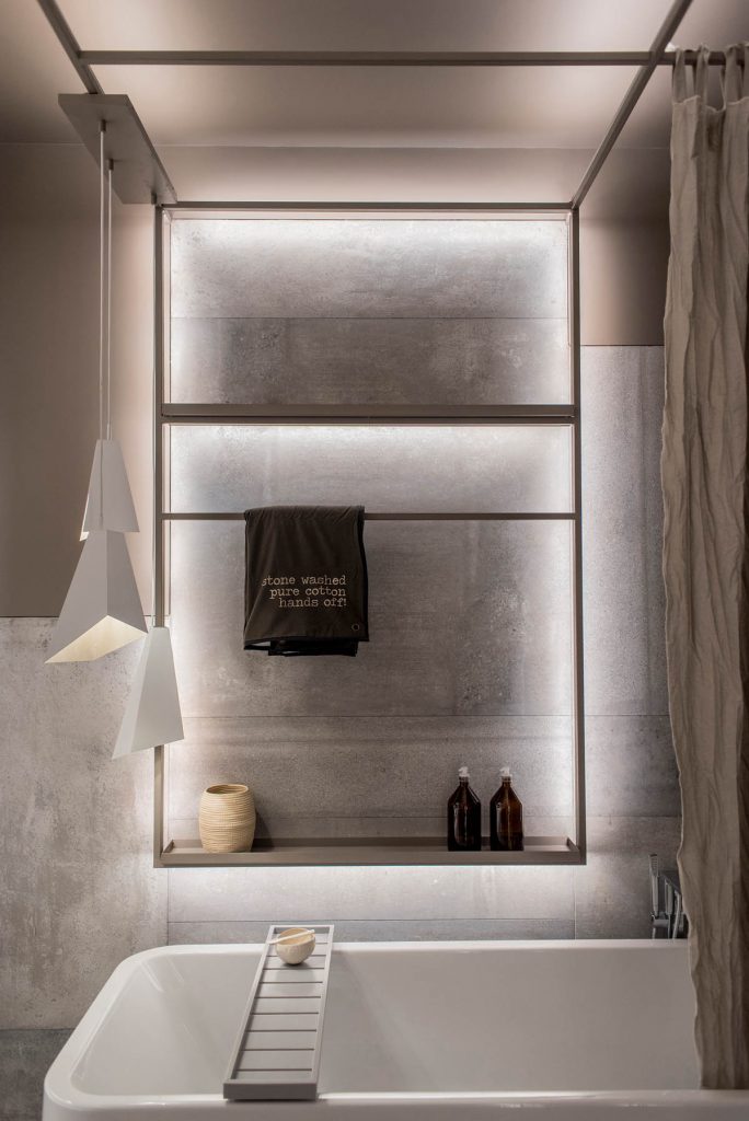 Las diferentes funciones y necesidades: colgado, apoyo, guardado e iluminación se desarrollan a través de una única estructura liviana de caño, superpuesta al revestimiento de las paredes y cielorraso. Es un objeto que envuelve al espacio y le da identidad. Contiene en su conjunto los accesorios de baño, barrales, bandejas de apoyo y diferentes climas de luz, que cambian automáticamente de manera suave y lenta.