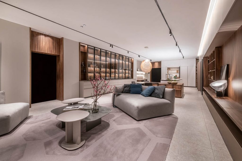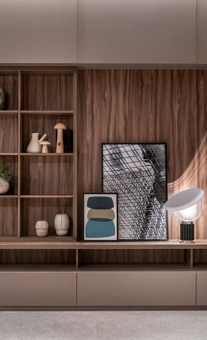 Inserto en un edificio racionalista, el diseño integra las funciones principales de la vida diaria: estar, comedor, cocina y home office. Estas áreas se fusionan de manera fluida, con límites desdibujados que potencian la continuidad espacial y la percepción de amplitud.