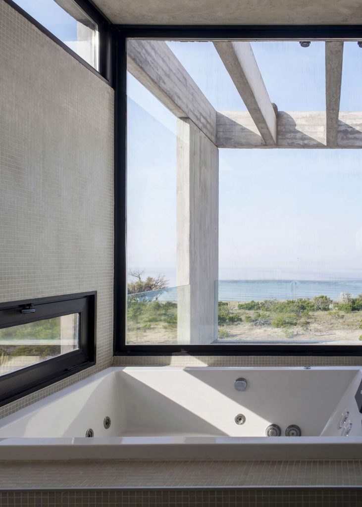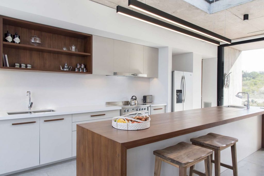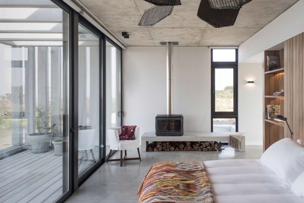 Lo trabajamos como un espacio interior / exterior donde los límites se diluyen y el paisaje es continuo. Contempla el río por el lado sur, el campo a través del ventanal al norte y el cielo por la lucarna sobre la isla de la cocina. La orientación es cruzada también como estrategia de confort ambiental natural.
